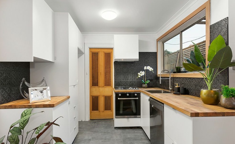 The kitchen features warm timber surfaces and an imported Italian tile splashback as well as a cafe-style window opening onto the sunny courtyard.